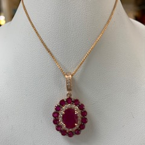 14ct Rose Gold Diamond and Ruby Cluster Pendant & Chain
