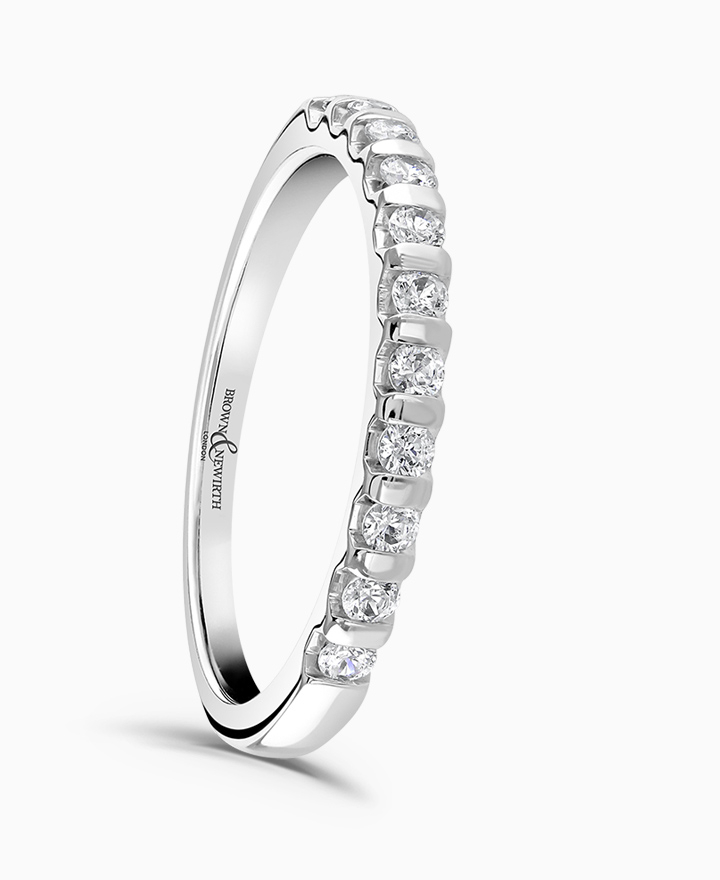 Handcrafted by Brown & Newirth; a total of 0.30ct round brilliant cut diamonds adorn 45% of this square edged band. Total carat weight 0.30ct