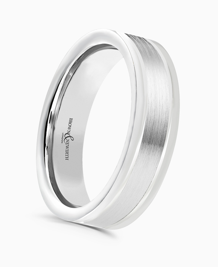 Handcrafted by Brown & Newirth; our flat top profile with brushed centre, v-cut detailing and polished square edges, presented in a medium gauge. Part of the Icon Collection