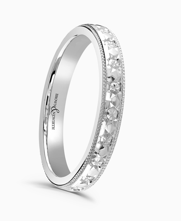 Handcrafted by Brown & Newirth; our flat sided 'D' shape profile is adorned with diamond cut detailing finished with mill grain edges, presented in a heavy gauge. Part of the Icon Collection.