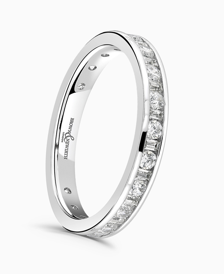 Handcrafted by Brown & Newirth; a captivating mix of rectangular baguette and round brilliant cut diamonds totalling 0.50ct adorn 75% of this square edged band. Total carat weight 0.50ct