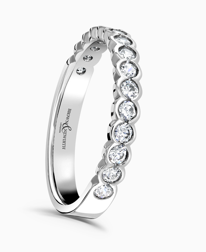 Handcrafted by Brown & Newirth; 0.50ct of bezel set round brilliant cut diamonds adorn 50% of this loop edged band. Total carat weight 0.50ct