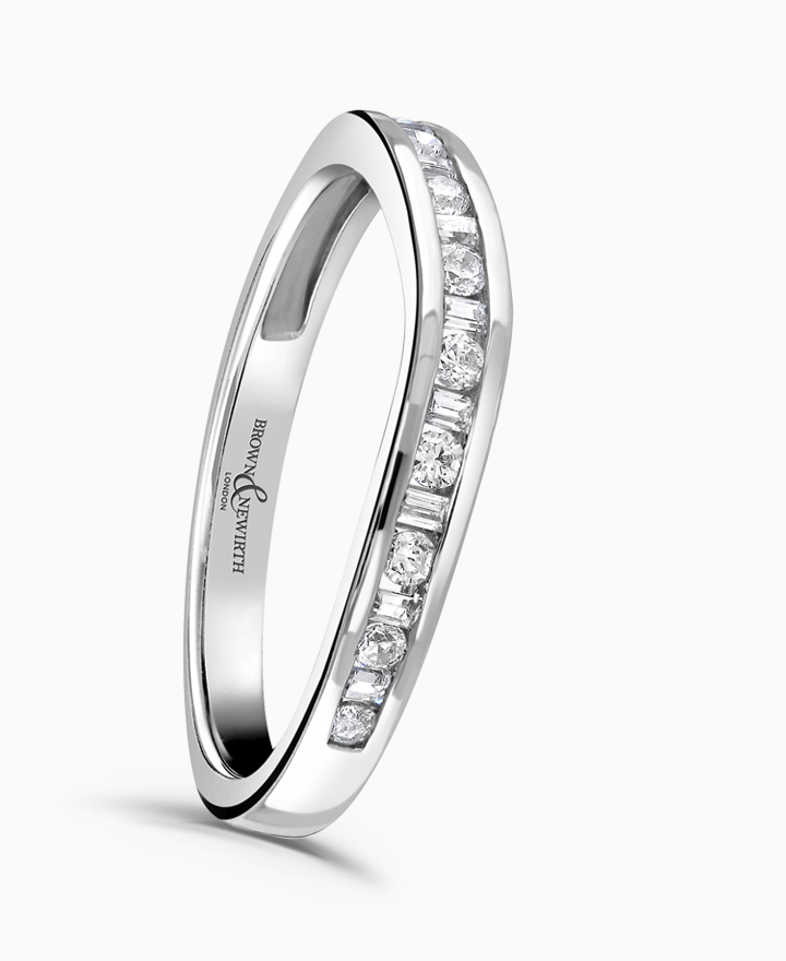 Handcrafted by Brown & Newirth; rectangular baguette and round brilliant cut diamonds flow through a curved top edge adorning of this square edged band. Total carat weight 0.20ct