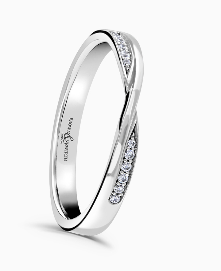 Handcrafted by Brown & Newirth; round brilliant cut diamonds totalling 0.06ct are set on the edges either side of the pinch on this bow design, presented on a classic court band.Total carat weight 0.06ct