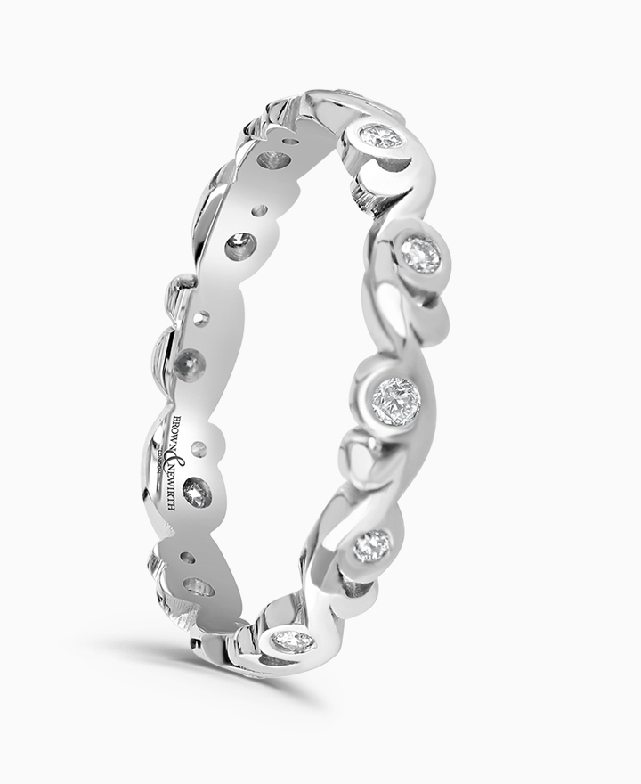 Handcrafted by Brown & Newirth; round brilliant diamonds set around the full hoop and decorated with swirl detailing, presented in a complimentary shaped band. Total carat weight 0.18ct