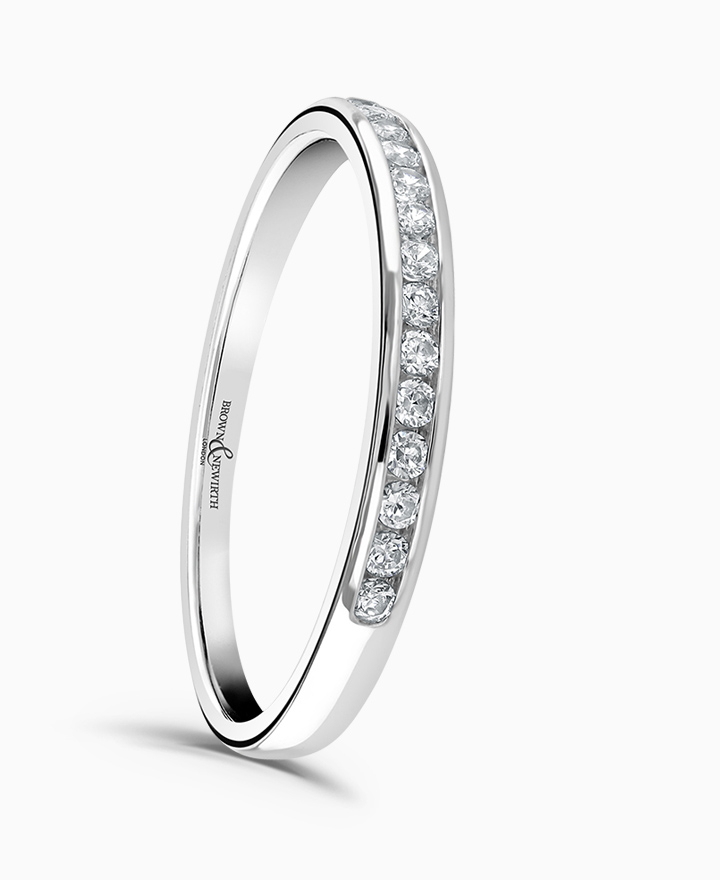 Handcrafted by Brown & Newirth; round brilliant cut diamonds totalling 0.15ct adorn 35% of this classic court band. Total carat weight 0.15ct