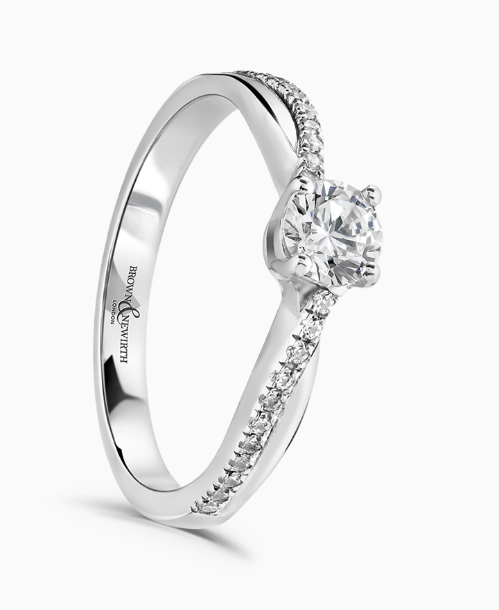 Handcrafted by Brown & Newirth; inspired by nature, organic lines twist up to embrace a 0.50ct round brilliant cut diamond, presented here on a diamond set band. Total 0.60ct. Part of the Entwined Collection.