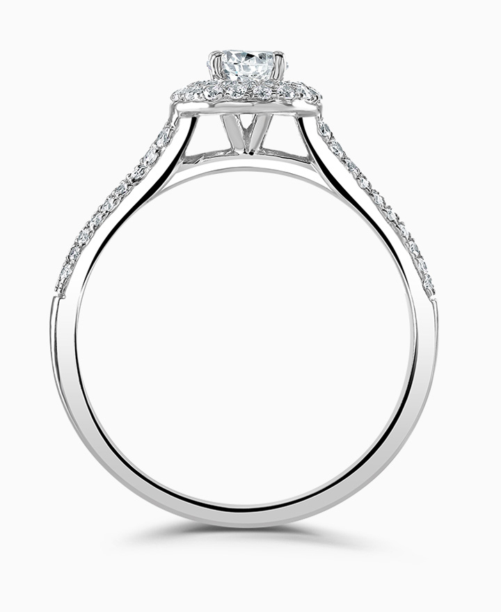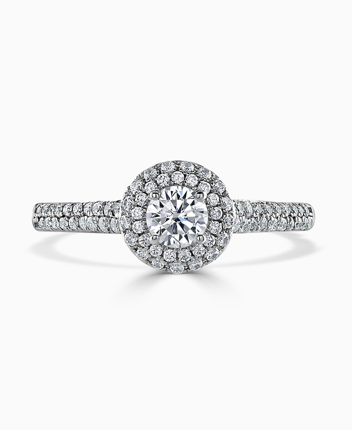 Handcrafted by Brown & Newirth; a double-row diamond halo frames the 0.33ct round brilliant cut diamond, presented here with double row diamond set shoulders. Total 0.64ct