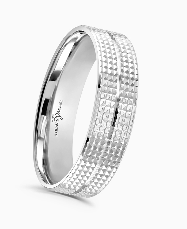 Handcrafted by Brown & Newirth; our flat top profile with knurled patterning, contrasting centre line detail and polished bevelled edges, presented in a medium gauge. Part of the Guilloche Collection