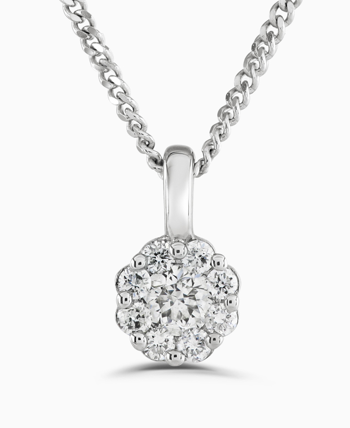 Handcrafted by Brown & Newirth; our open set round brilliant diamond cluster stud pendant, supplied on a 16' to 18' adjustable trace chain. Total 0.15ct. This is part of our in stock range, order today for quick delivery.