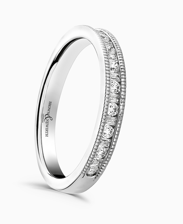 Handcrafted by Brown & Newirth; a captivating mix of rectangular baguette and round brilliant cut diamonds adorn 33% of this square edged band with mill grain detailing. Total carat weight 0.20ct