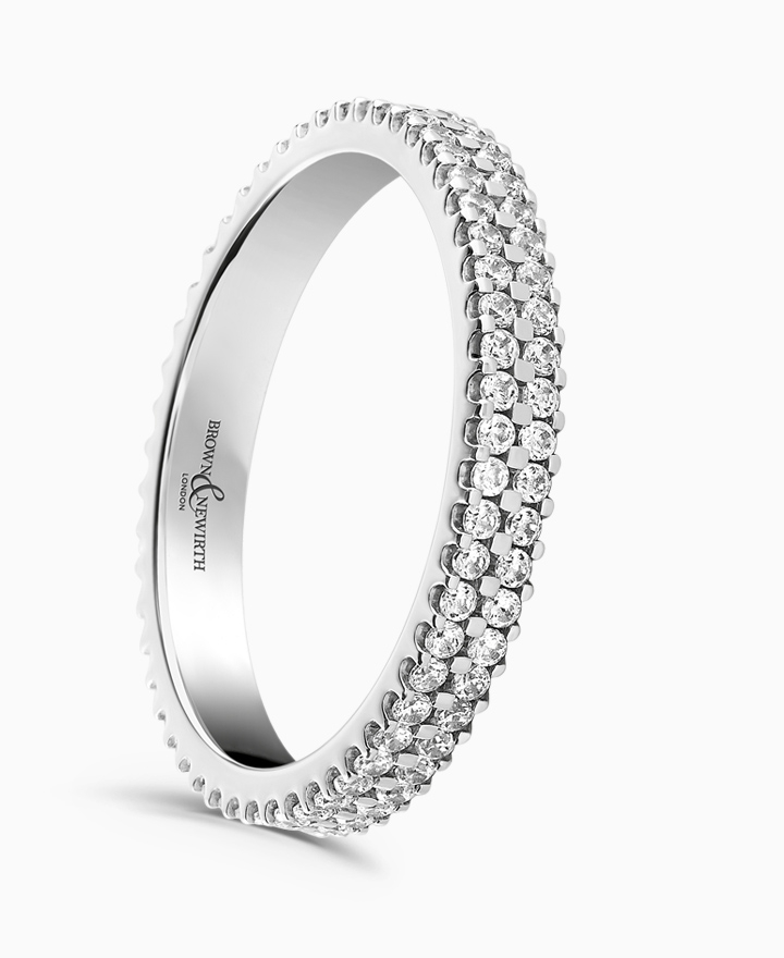 Handcrafted by Brown & Newirth; a double row of round brilliant cut diamonds adorn the full hoop of this square edged band. Total carat weight 0.56ct