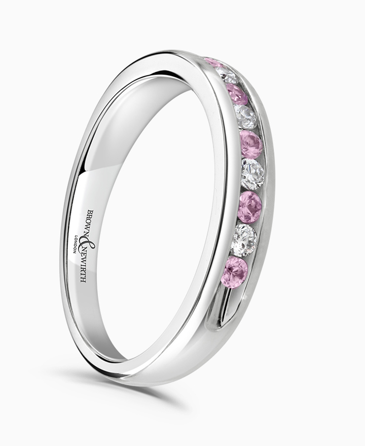 Handcrafted by Brown & Newirth; round brilliant cut diamonds and pink sapphires adorn 33% of this classic court band. Total carat weight 0.33ct