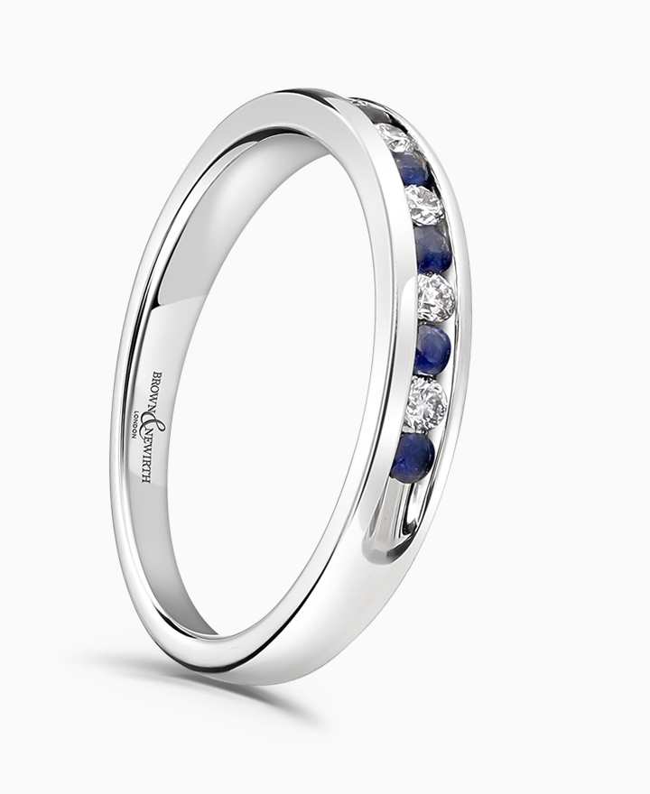 Handcrafted by Brown & Newirth; round brilliant cut diamonds and blue sapphires adorn 33% of this classic court band. Total carat weight 0.25ct