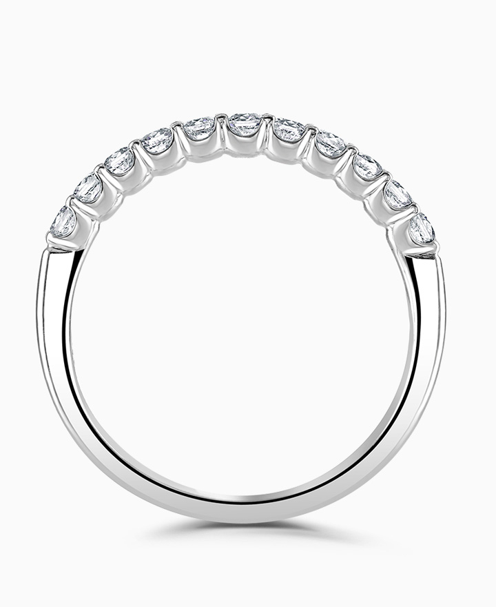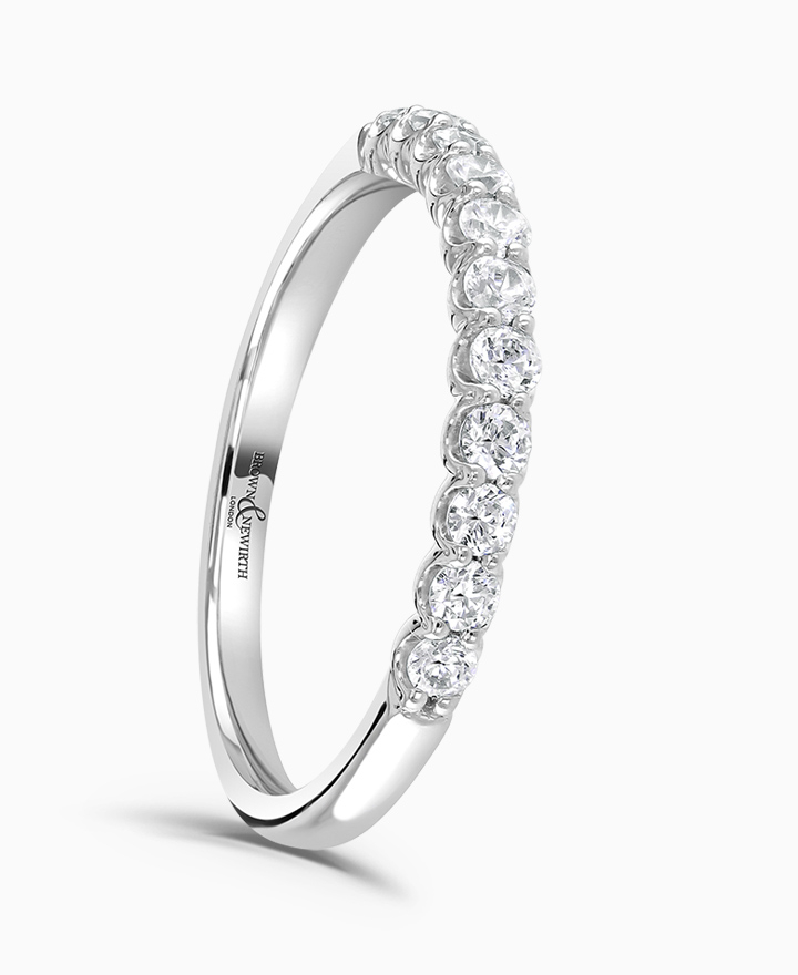 Handcrafted by Brown & Newirth; a cupped claw setting of round brilliant cut diamonds covering 50% of a classic court band. Total carat weight 0.34ct
