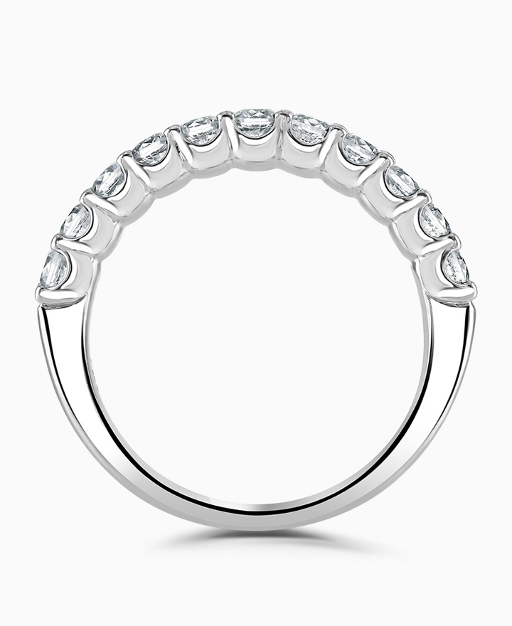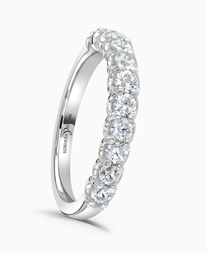 Handcrafted by Brown & Newirth; a cupped claw setting of round brilliant cut diamonds covering 50% of a classic court band. Total carat weight 0.75ct