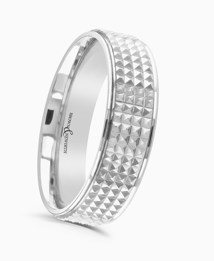 Handcrafted by Brown & Newirth; our flat top profile with knurled patterning and contrasting polished rolled edges, presented in a medium gauge. Part of the Guilloche Collection