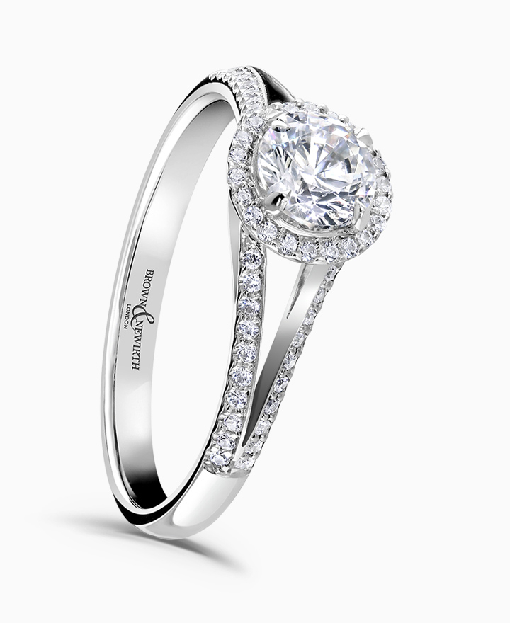 Handcrafted by Brown & Newirth; our signature 'bloom' floral detailing with diamond halo framing a round brilliant cut diamond, presented here on a diamond set split open shoulder band. Centre 0.50ct, total 0.62ct. Part of the Bloom Collection.