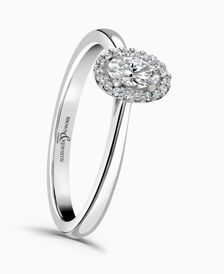 Handcrafted by Brown & Newirth; our signature 'bloom' floral detailing with diamond halo framing an oval cut diamond, presented here on a classic court band. Centre 0.50ct, total 0.54ct. Part of the Bloom Collection.