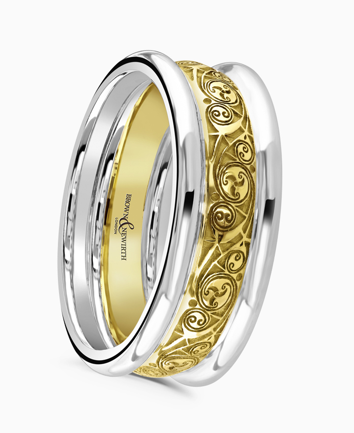 Handcrafted by Brown & Newirth; our classic court with 'Triqueta' design meaning 'honor the mother' with contrasting colour edge rails, presented in a medium gauge.