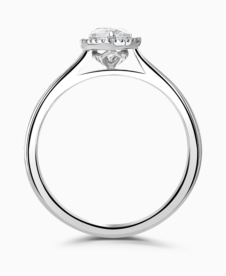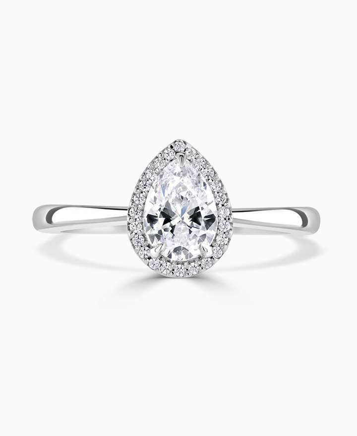 Handcrafted by Brown & Newirth; our signature 'bloom' floral detailing with diamond halo framing a pear cut G Vs diamond, presented here on a classic court band. Centre 0.50ct, total 0.55ct. Part of the Bloom Collection.