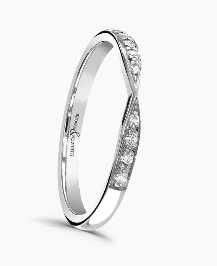 Handcrafted by Brown & Newirth; round brilliant cut diamonds are set either side of the pinch on this bow design, presented on a classic court band. Total carat weight 0.05ct