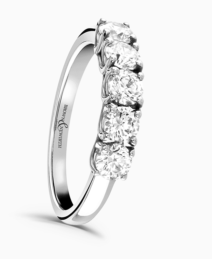 Handcrafted by Brown & Newirth; a classic setting with kiss detailing for these five round brilliant cut diamonds, presented here on a straight edged band. Total 1.25ct