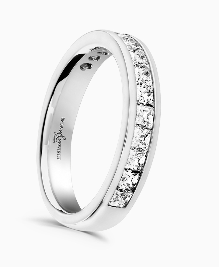 Handcrafted by Brown & Newirth; square princess cut diamonds sit edge to edge adorning 50% of this straight edged band. Total carat weight 1.00ct