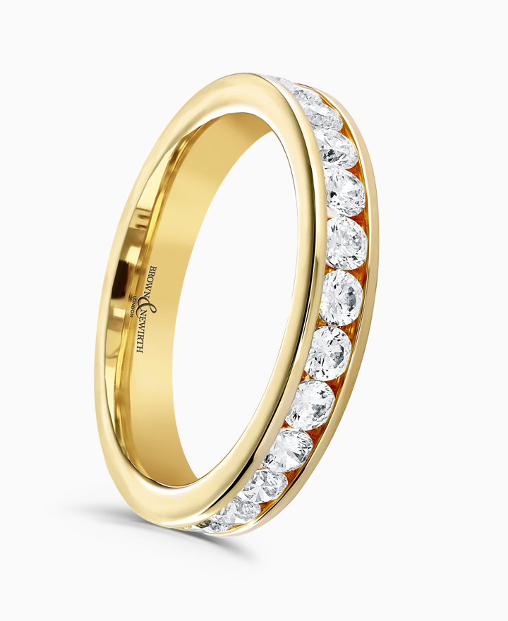 Handcrafted by Brown & Newirth; round brilliant cut diamonds adorn 45% of this straight edged band. Total carat weight 0.22ct