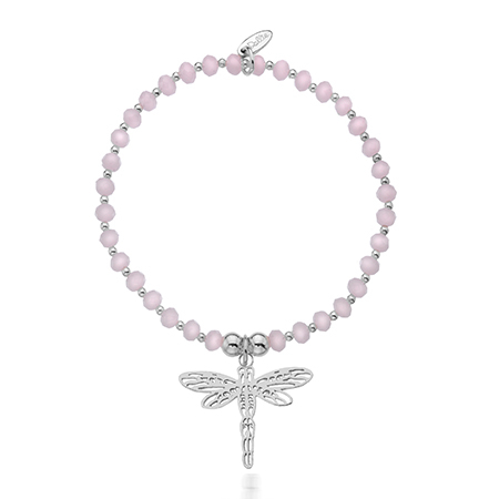 The palest of twinkling pink crystal beads really get your shimmer on, combined with sterling silver bead accents and beautiful filigree dragonfly charm to tickle your fancy!