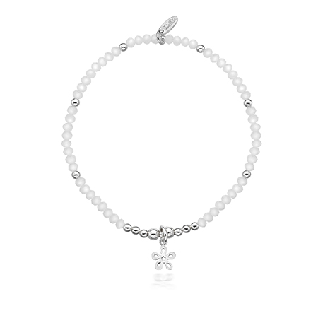 Our tiny posy flower charm is a tribute to the tiny white flowers of the coastal plant 'Sea Rocket' seen all along our Lincolnshire coast... our silver posy charm complimented by twinkling white crystal beads and sterling silver bead accents, a pretty bracelet for a dainty flower power girl.