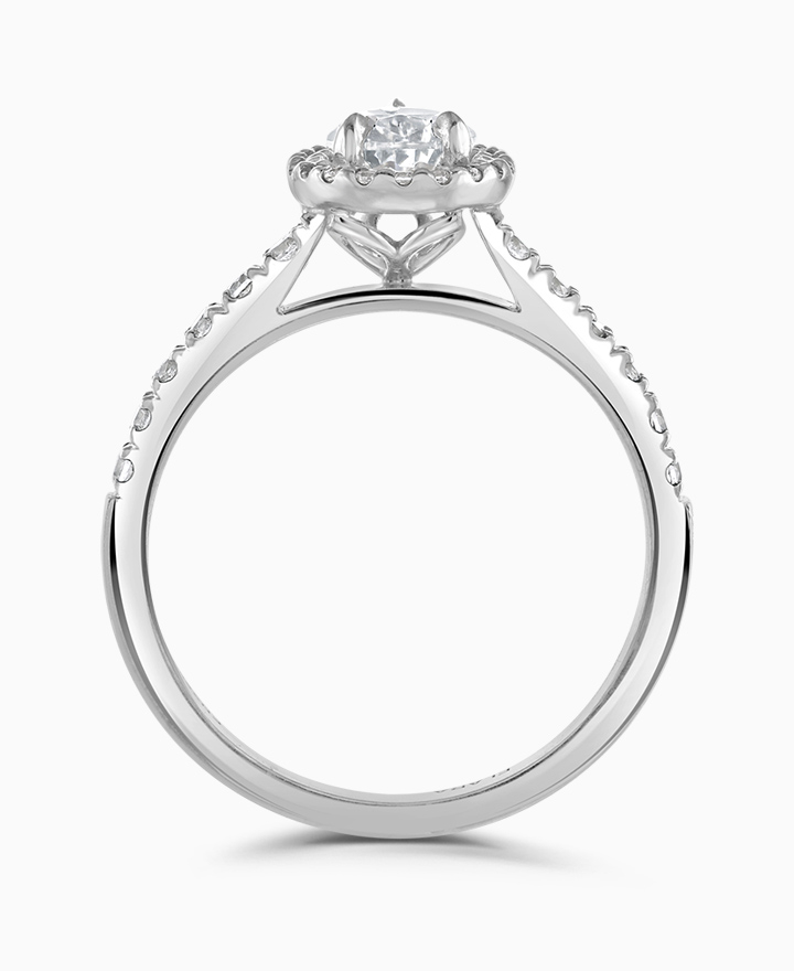 Handcrafted by Brown & Newirth; our signature 'bloom' floral detailing with diamond halo framing a pear cut diamond, presented here on a diamond set band. Centre 0.70ct, total 1.00ct. Part of the Bloom Collection.