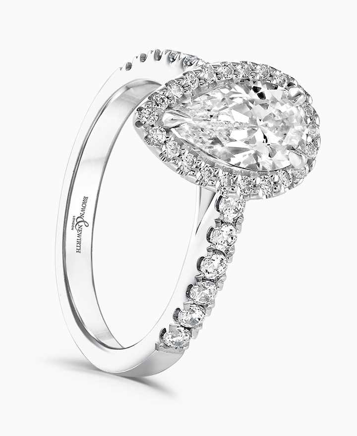 Handcrafted by Brown & Newirth; our signature 'bloom' floral detailing with diamond halo framing a pear cut diamond, presented here on a diamond set band. Centre 0.50ct, total 0.72ct. Part of the Bloom Collection.