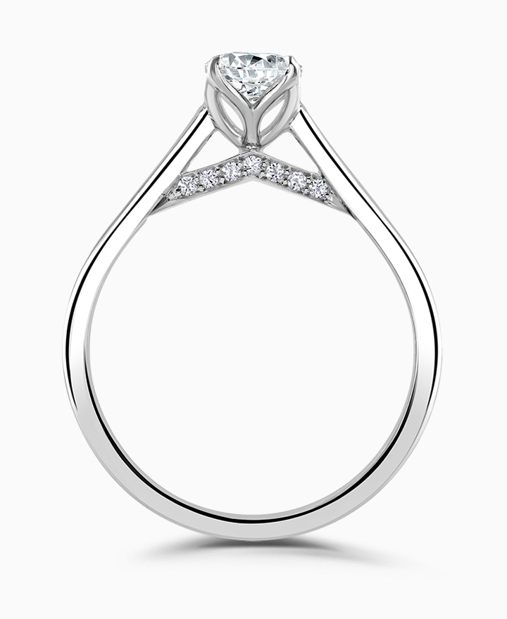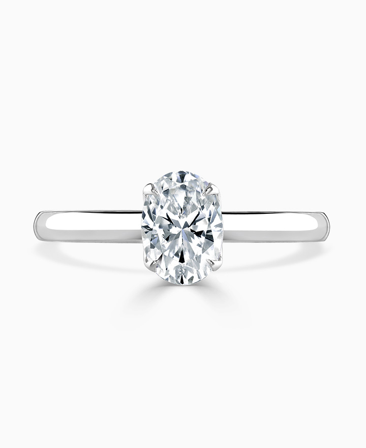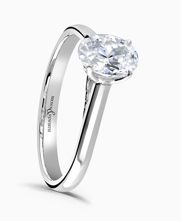 Handcrafted by Brown & Newirth; our signature 'bloom' floral detailing for an oval cut diamond, presented here with side set diamonds on a classic court band. Centre 0.70ct, total 0.77ct. Part of the Bloom Collection.