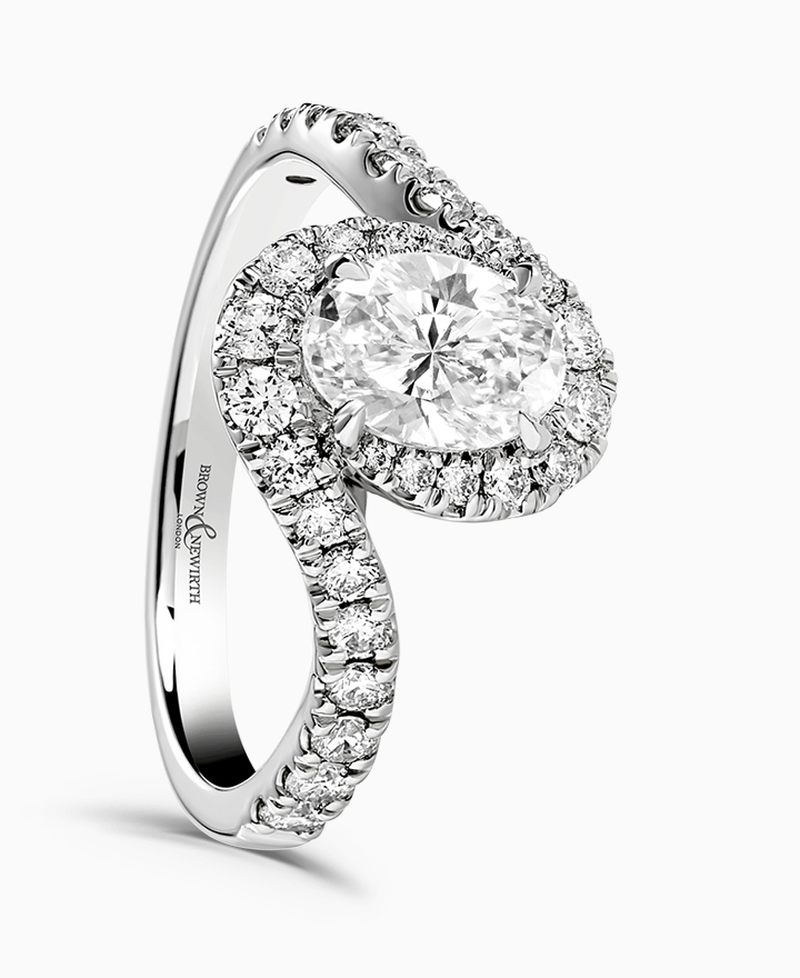 Handcrafted by Brown & Newirth; curated by our design club team, organic forms with diamond set shoulders and halo perfectly lead to an oval cut diamond. Centre 1.00ct, total 1.58ct. Part of the Icons Collection.