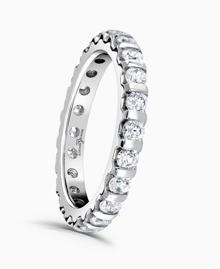Handcrafted by Brown & Newirth; round brilliant cut diamonds adorn the full hoop of this loop edged band. Total carat weight 1.00ct