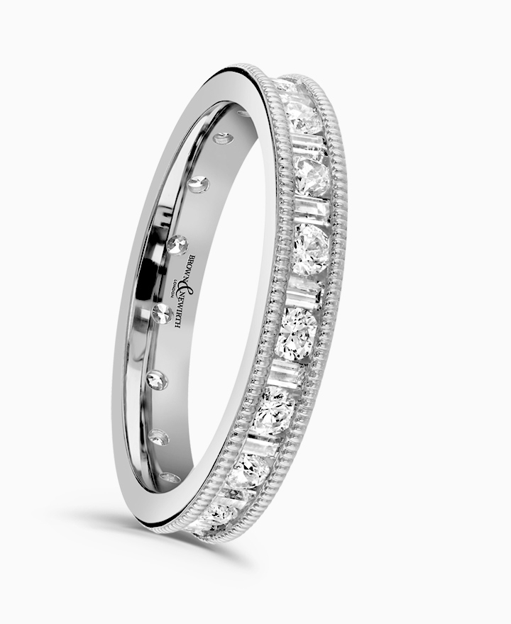 Handcrafted by Brown & Newirth; a captivating mix of rectangular baguette and round brilliant cut diamonds adorn the full hoop of this square edged band finished with a mill grain edge. Total carat weight 2.00ct