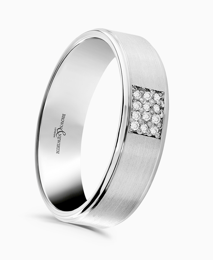 Handcrafted by Brown & Newirth; a grid of round brilliant cut diamonds set atop a contrasting finish with polished rolled edges, presented on a flat top band. Total carat weight 0.08ct