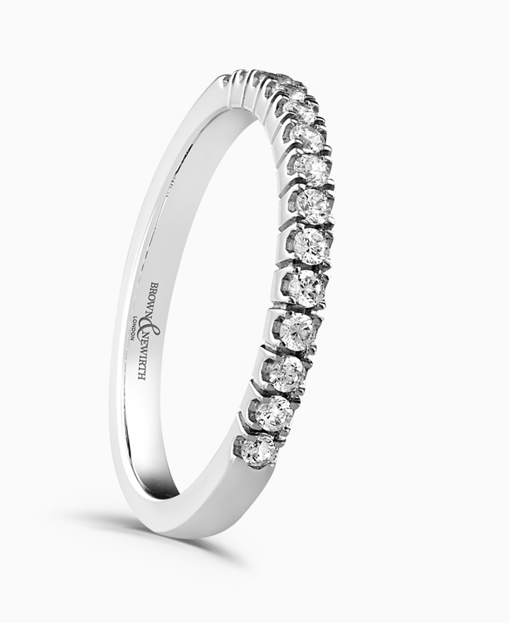 Handcrafted by Brown & Newirth; open set round brilliant cut diamonds adorn 40% of this straight edged band. Total carat weight 0.75ct