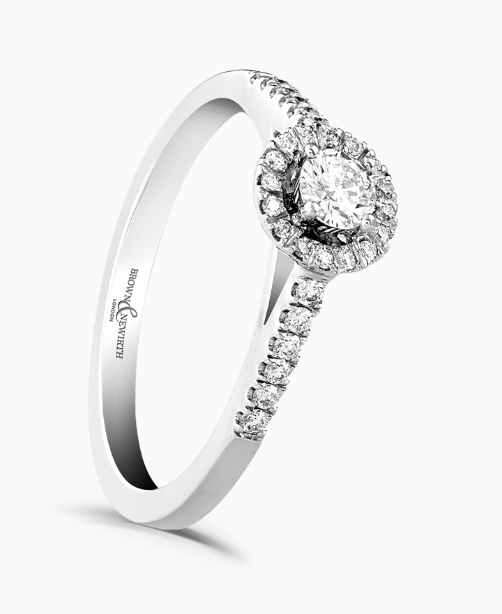 Handcrafted by Brown & Newirth; a diamond halo frames the round brilliant cut diamond, presented here with diamond set shoulders. Centre 0.18ct, total 0.33ct.