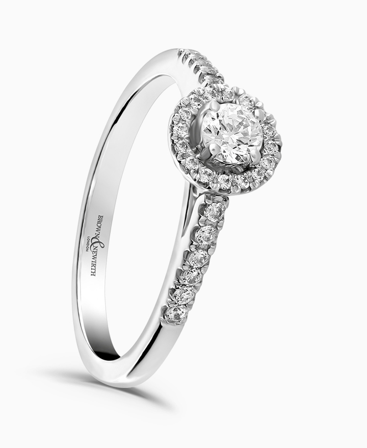 Handcrafted by Brown & Newirth; a diamond halo frames the round brilliant cut diamond, presented here with diamond set shoulders. Centre 0.30ct, total 0.50ct.