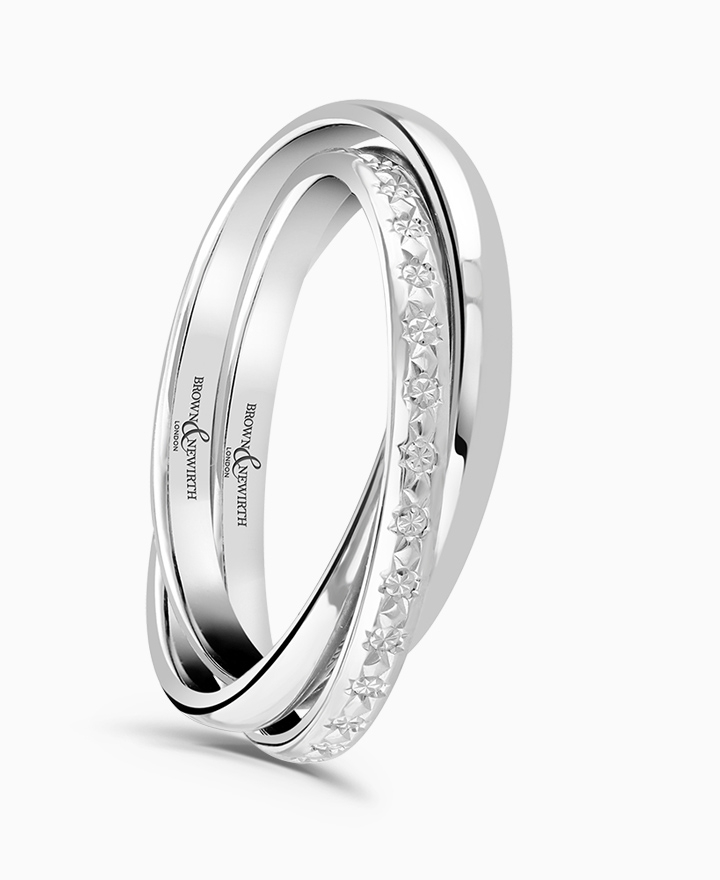 Handcrafted by Brown & Newirth; three of our classic court profiles with one adorned with our distinct diamond cut pattern, presented in a light weight. Part of the Icon Collection.