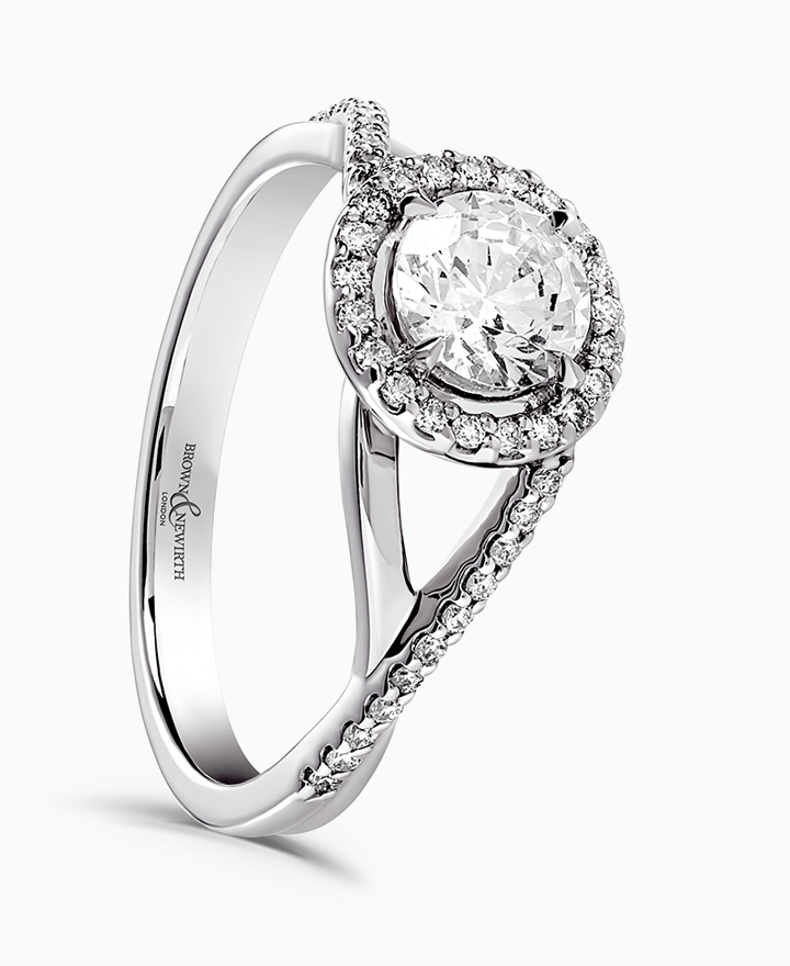 Handcrafted by Brown & Newirth; curated by our design club team, organic forms with diamond set shoulders and halo perfectly lead to a round brilliant cut diamond. Centre 0.70ct, total 0.90ct. Part of the Icons Collection.