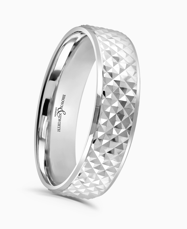 Handcrafted by Brown & Newirth; our flat top profile with knurled patterning and contrasting polished stepped edges, presented in a medium gauge. Part of the Guilloche Collection