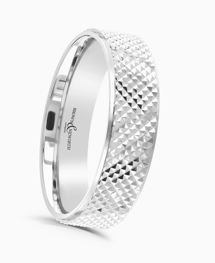 Handcrafted by Brown & Newirth; our flat top profile with knurled patterning and contrasting polished stepped edges, presented in a medium gauge. Part of the Guilloche Collection