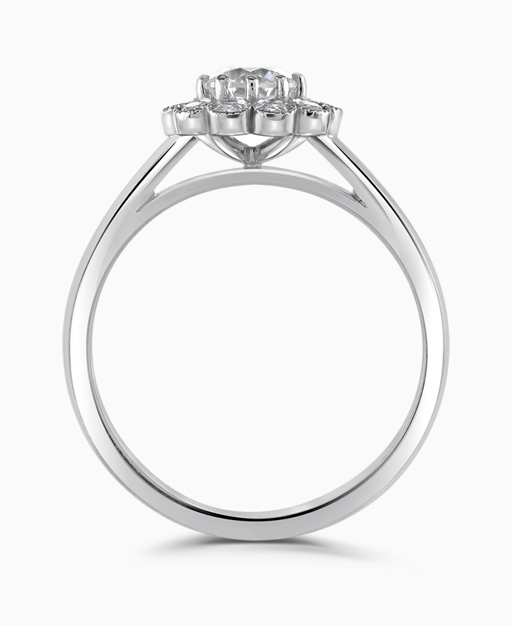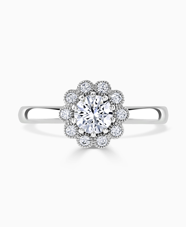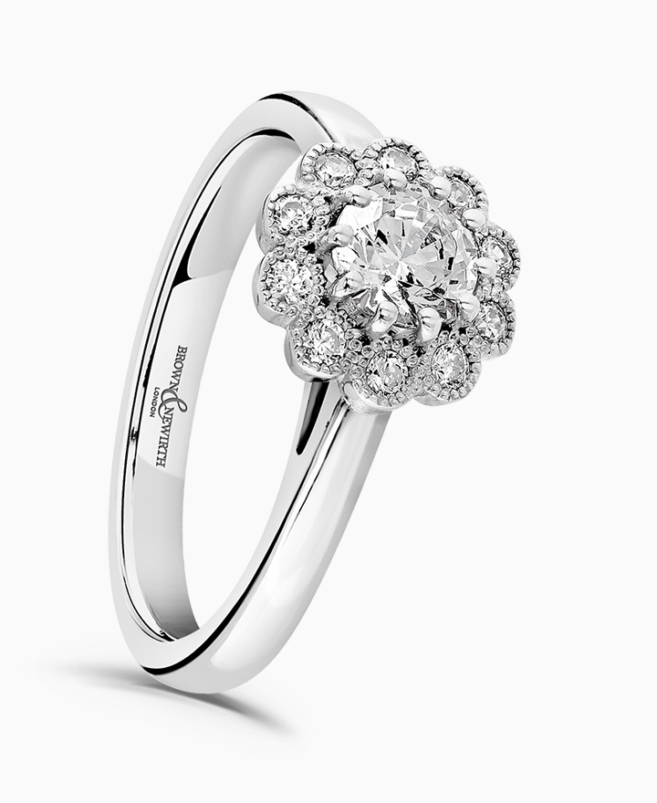 Handcrafted by Brown & Newirth; a diamond halo frames the round brilliant cut diamond, presented here on a straight edged band. Centre 0.50ct, total 0.65ct. Part of the Vintage Collection