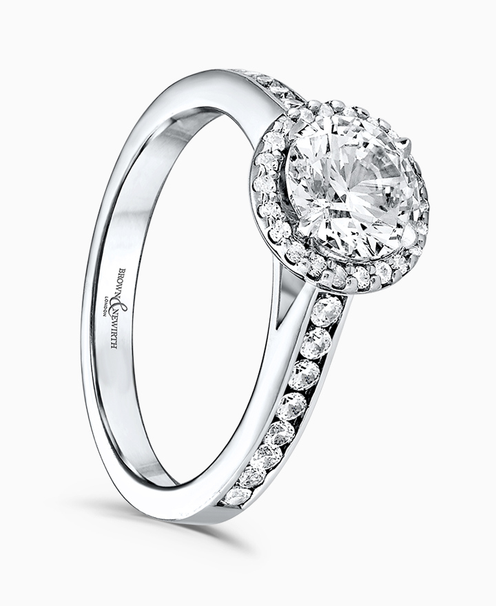 Handcrafted by Brown & Newirth; our signature 'bloom' floral detailing with diamond halo framing a round brilliant cut diamond, presented here on a diamond set band. Centre 0.50ct, total 0.72ct. Part of the Bloom Collection.