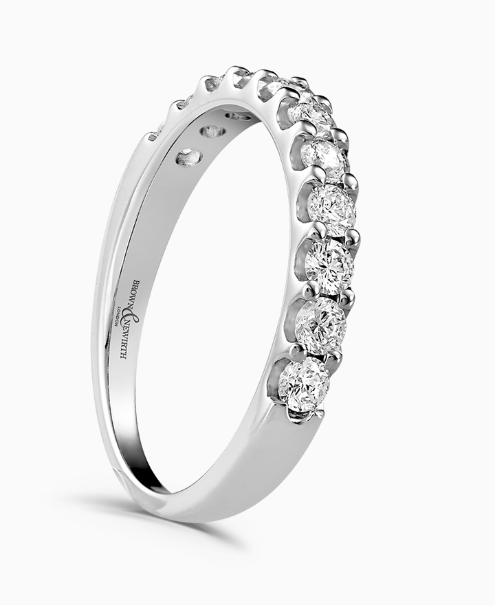 Handcrafted by Brown & Newirth; round brilliant cut diamonds adorn 40% of this classic court band. Total carat weight 0.50ct. This is part of our in stock range, available in platinum & 18ct yellow gold. Order today for quick delivery.