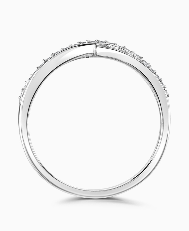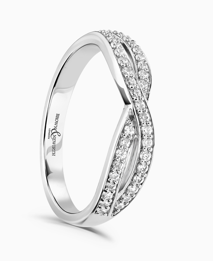 Handcrafted by Brown & Newirth; inspired by nature, organic lines twist up displaying brilliant cut diamonds on a classic court band. Part of the Entwined Collection. Total carat weight 0.19ct