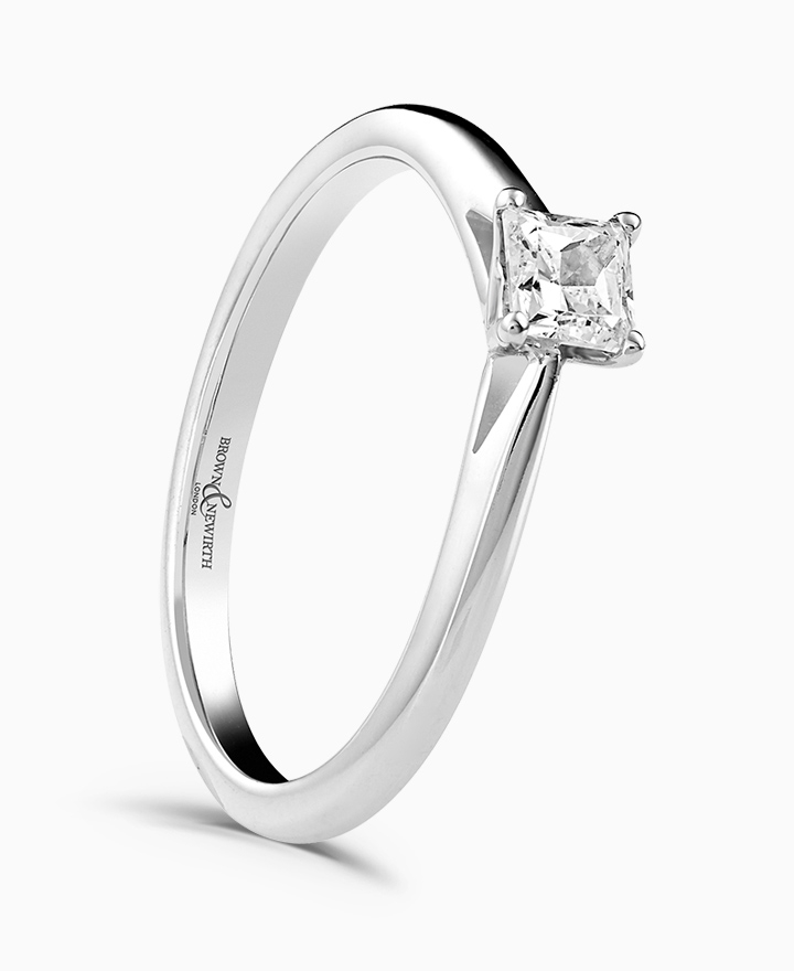 Handcrafted by Brown & Newirth; a delicate four claw setting perfectly elevates the square princess cut diamond, presented here on a classic court band. 0.33ct